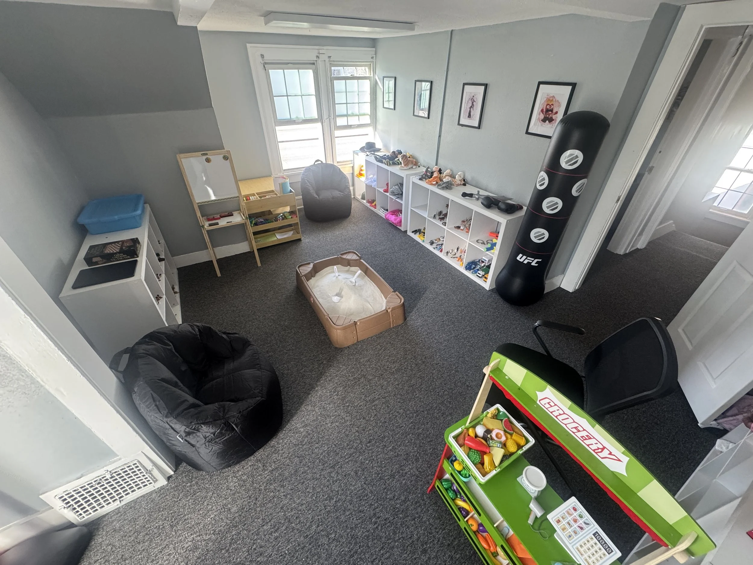A safe, structured playroom with carefully chosen toys (figures, dolls, art supplies, games, sand tray, puppets)